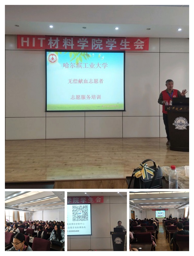 为保障志愿者自身安全,帮助他们消除疑虑,提高服务质量,活动特别邀请哈尔滨市血液中心王晓明、艾滋病预防控制所喻欢担任嘉宾,在一、二校区举办两场志愿者培训与“无偿献血及艾滋病预防”知识讲座。两位老师向全体志愿者做了关于艾滋病预防、无偿献血的介绍,并就献血活动中的常规注意事项对志愿者进行了系统培训。他们结合自身工作和志愿服务经历,分享了他们的感受,鼓励同学们积极投身公益,参与无偿献血,让志愿的承诺在热心服务中升华。