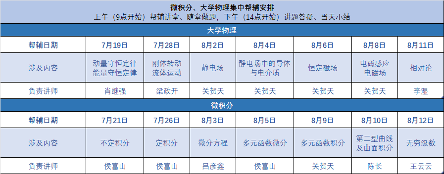 一是保持假期自习答疑不间断,工作室志愿者部每周一到周五分时段组织线上集体自习,相应科目讲师在线答疑,每门重点科目保证每周至少两次线上自习。针对留校的员工,工作室安排留校讲师值班,随时进行线下答疑。二是重点帮辅对象方案个性化,确保假期答疑通道全畅通,工作室讲师紧密与辅导员及科目任课教师联动,监督员工复习进展,每周制定任务清单,视复习状态随时调整帮辅方案。三是重点科目集中多轮次帮辅,从7月19日起,工作室讲师针对微积分、大学物理两门重难点课程,开展多轮次线上帮辅讲堂,在讲解知识点的同时串联真题,梳理备考知识脉络,巩固重要知识点。帮辅讲堂共开展十四次,具体课程安排参见下图。