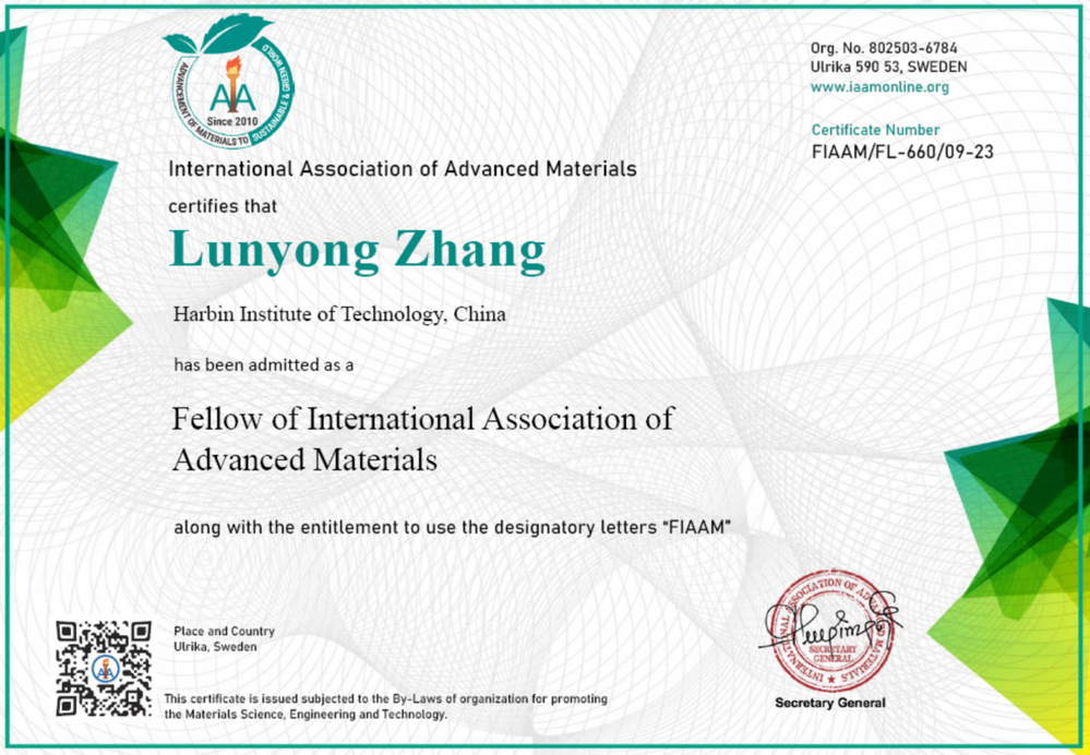 国际先进材料学会(IAAM)是全球先进材料领域著名的非营利性国际学术组织,致力于为先进材料科学、工程和技术的快速发展在世界范围内提供一个高水平的学术平台;总部位于瑞典,现已发展成为材料科学领域各类学科领军人才的聚集者和领导者。“IAAM科学家奖”与“IAAM终生会士”均授予在先进材料科学与技术领域做出突出贡献的研究人员,以表彰他们在专业领域取得的显著成就。