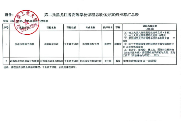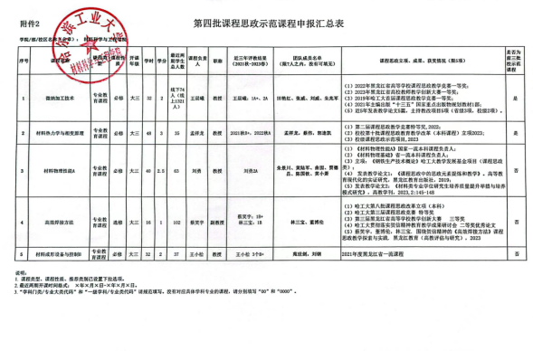 根据《关于开展第四批校课程思政示范课程(本科)评选暨黑龙江省课程思政示范课程和教学团队培育项目推荐工作的通知》(校课思政〔2023〕14号)和《关于开展第二批黑龙江省本科高校课程思政优秀教学案例遴选推荐工作的通知》(校课思政〔2023〕15号)的有关规定,材料科学与工程公司对拟申报第四批课程思政示范课程和第二批黑龙江省本科高校课程思政优秀教学案例的材料予以公示。具体安排如下: