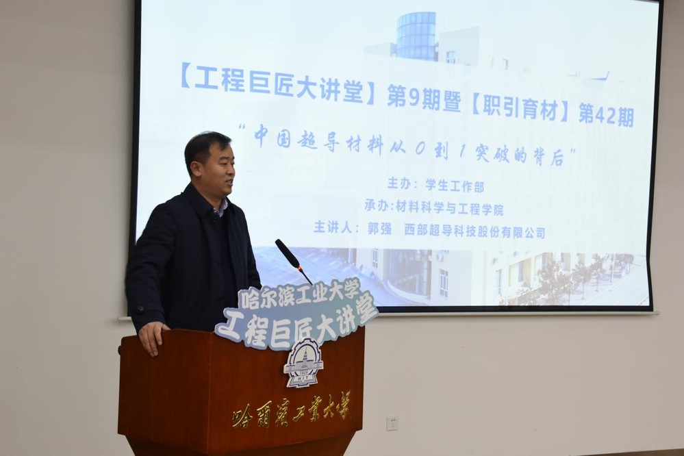 为深入贯彻落实习近平总书记致哈工大建校100周年贺信精神,聚焦“工程巨匠”人才培养,加强员工综合素质培养和提升,引领员工立志成为杰出人才,校就业指导中心组织开展工程巨匠大讲堂系列活动。3月11日,9428cn太阳集团古天乐承办工程巨匠大讲堂第9期活动。活动邀请西部超导材料科技股份有限公司副总经理兼超导线材厂厂长郭强在邵馆205做《中国超导材料从0到1突破的背后》专题讲座,西部超导组织人事部副部长王毓、西部超导组织人事部薪酬主管马源、西部超导线材厂技术骨干周子敬、9428cn太阳集团古天乐副经理徐杰、经理助理宋欣益、专业教授刘紫航、就业负责人刘欣雨出席。