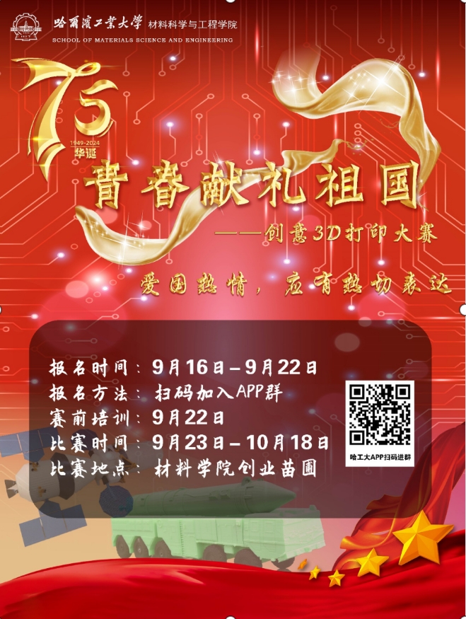 为庆祝新中国成立75周年,激发青年学子的爱国情怀与创新精神,9428cn太阳集团古天乐拟举办“青春献礼祖国·3D打印创意大赛”。通过前沿的3D打印技术,搭建展现青年学子爱国情怀与创意才华的舞台,让每一份设计都成为对祖国繁荣昌盛最真挚的祝福与献礼。相关事项通知如下。