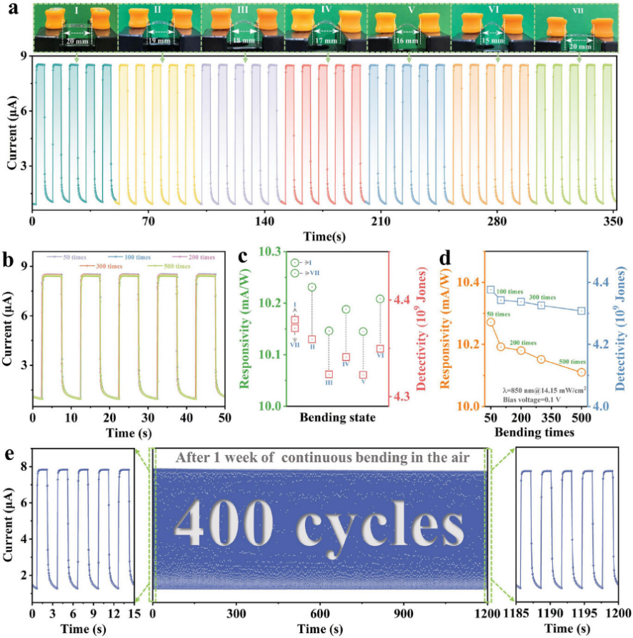 柔性探测器能够有效克服机械性能的限制,利用其柔性化可完成曲面等复杂环境中的探测任务。因此,研究与开发柔性光电探测器的重要性不言而喻。柔性探测器与探测材料的结构设计密切相关。目前大多数探测材料是由结构单元堆叠而成的,其经历弯曲后不可避免地会发生断裂,这不利于柔性器件在连续弯曲状态下进行长期工作。然而,柔性光电探测器的机械稳定性和弯曲耐久性对于其实际应用至关重要。