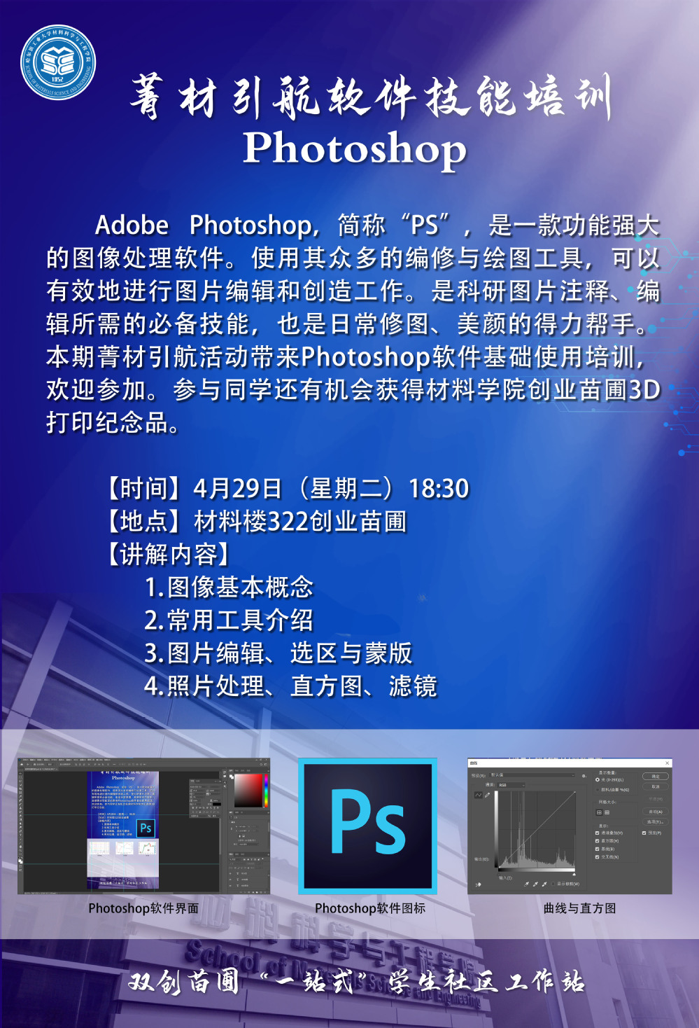 Adobe Photoshop,简称“PS”,是一款功能强大的图像处理软件。使用其众多的编修与绘图工具,可以有效地进行图片编辑和创造工作。是科研图片注释、编辑所需的必备工具,也是日常修图、美颜的得力帮手。本期菁材引航活动带来Photoshop软件基础使用培训,欢迎参加。参与同学还有机会获得9428cn太阳集团古天乐创业苗圃3D打印纪念品。