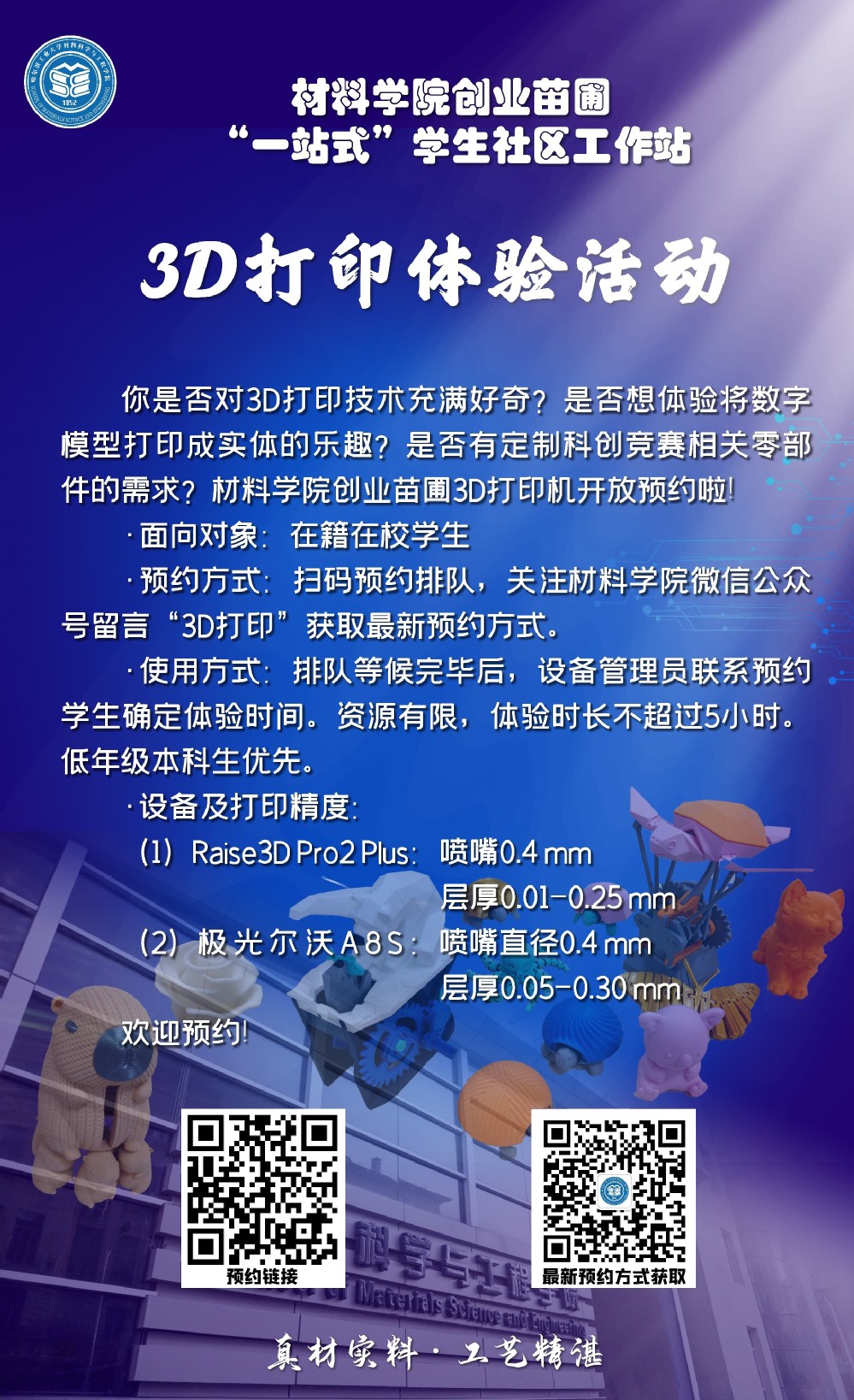三、体验方式:排队预约,低年级本科生优先。预约类型分为创新创业类和兴趣爱好类,创新创业类预约优先排队。关注“9428cn太阳集团古天乐9428cn太阳集团古天乐”微信公众号后台发送“3D打印”获取最新预约链接。