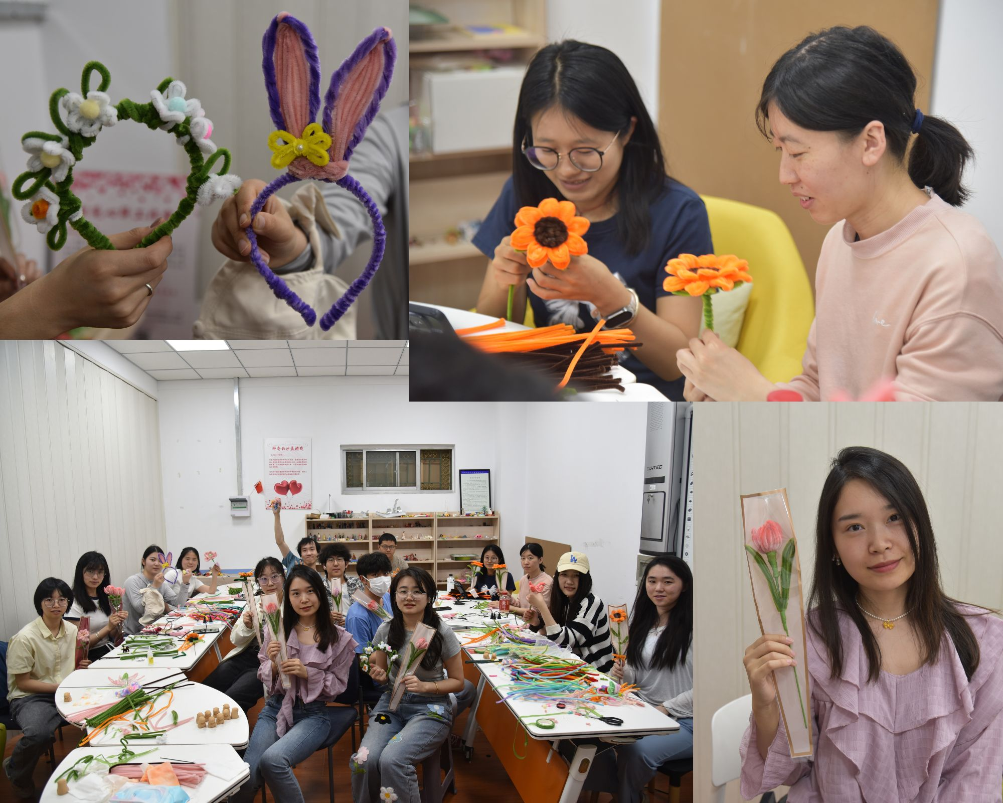 5月27日中午,“绒·植趣”——扭扭棒制作活动在材苑心驿工作室展开。同学们用五彩扭扭棒制作发卡、花朵或小动物,灵活的手指翻飞间,一件件俏皮的作品诞生。轻松活泼的氛围让参与者在互动中收获轻松与快乐。