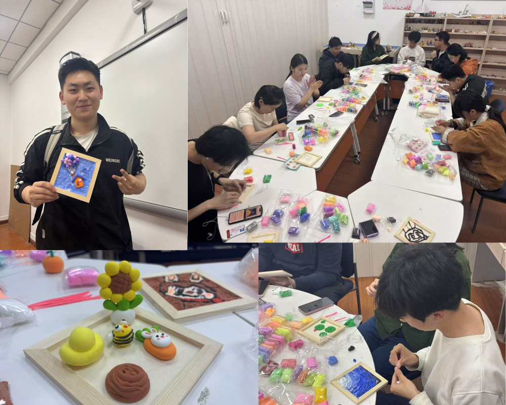 与此同时,学院组织的各项特色活动也在有条不紊地开展。这些精心设计的活动为同学们提供了多样化的参与选择,营造了积极健康的校园心理文化氛围。5月22日晚间,“塑·心语”——减压黏土创意画在材苑心驿工作室开展。同学们用多彩黏土捏制出花朵、动物等图案,拼贴成充满童趣的立体画作。活动不仅激发了同学们的想象力,更让大家在揉捏塑形的过程中释放情绪,体验专注与治愈的力量。