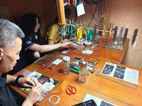 当日下午,实践团走进龙太阳苗族银饰锻造工坊。苗族银饰锻造技艺,作为国家级非物质文化遗产,是苗族文化的璀璨明珠。实践团成员携手北京科技大学银响酉方实践团队,共同与龙太阳实践基地签署合作协议,共建非遗传播公众号,让苗族银饰故事“出圈”。在匠人工作室,同学们近距离触摸银饰作品,挖掘创作背景、纹样寓意,探寻银饰从灵感溯源到錾刻、镶嵌的技艺密码。实践团以年轻人喜闻乐见的方式,策划银饰故事线上展厅,助力非遗“破圈新生”。