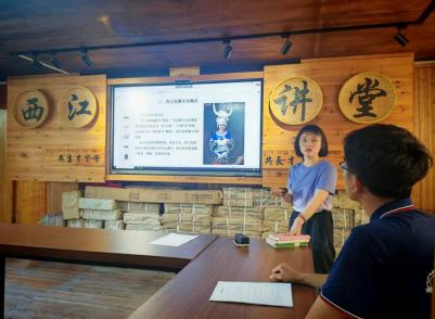中午时分,实践团踏入千户苗寨博物馆。千户苗寨博物馆是苗族文化的“基因库”,详实呈现了西江苗寨的发展历程与民俗文化脉络,音乐展区里依次陈列着芦笙、铜鼓、木鼓等苗族乐器,博物馆工作人员为实践团讲解乐器在苗族传统音乐中的搭配奥秘与演奏场景。同学们俯身细察乐器纹理,感受历史沉淀;模仿铜鼓敲击节奏,亲身体验苗族音乐独特魅力。在沉浸式学习中,实践团加深了对苗族音乐文化的理解,为后续探访非遗技艺筑牢文化认知根基。