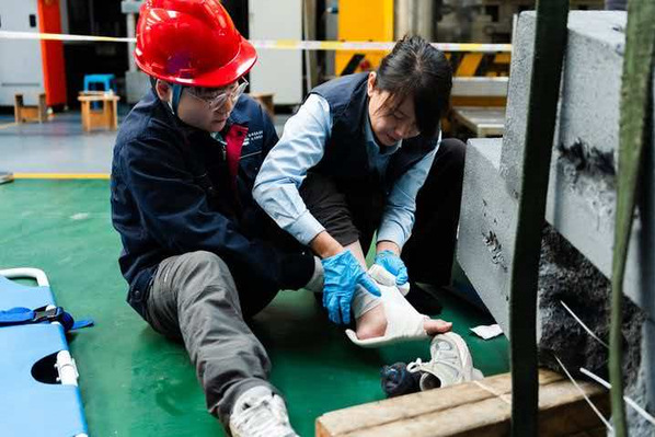 本次演练模拟真实险情:作业前未落实工具合规核验,未确认吊带检验状态,导致非标吊带无法承受设备重量,在安全员检查物品吊装状态时突然断裂,造成安全员脚部开放性创伤。